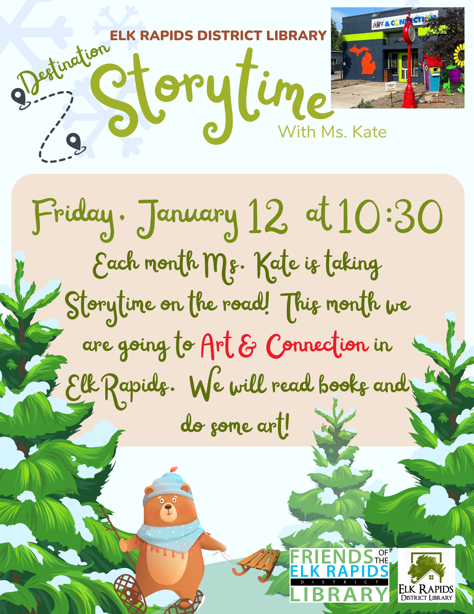 Destination Story Time @ Art and Connection Friday, January 12, 2024 10:30 AM 11:30 AM Art and Connection 965 Green Street Elk Rapids United States (map) Google Calendar ICS