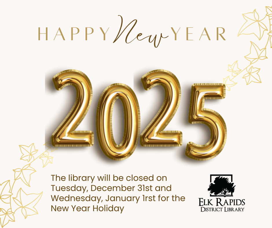 Closed for New Years Tuesday, December 31, 2024 12:00 AM Wednesday, January 1, 2025 11:55 PM Elk Rapids District Library 300 Isles of Pine Elk Rapids, MI 49629 United States (map) Google Calendar ICS