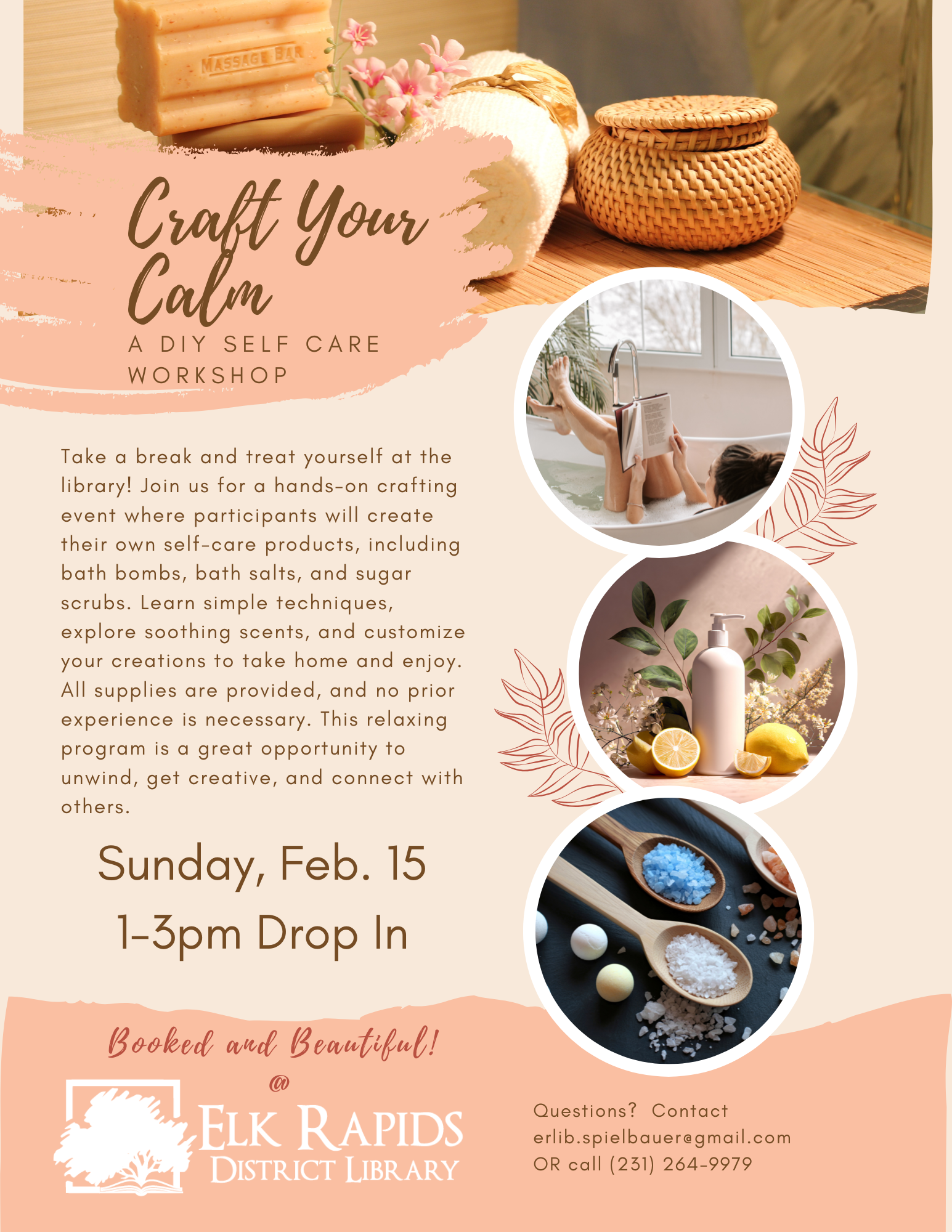 Craft Your Calm Sunday, February 15, 2026 1:00 PM 3:00 PM Elk Rapids District Library 300 Isles of Pine Elk Rapids, MI 49629 United States (map) Google Calendar ICS