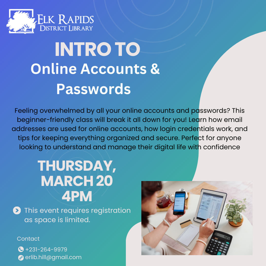 Introduction to online accounts and password Thursday, March 20, 2025 4:00 PM 5:30 PM Elk Rapids District Library 300 Isles of Pine Elk Rapids, MI 49629 United States (map) Google Calendar ICS