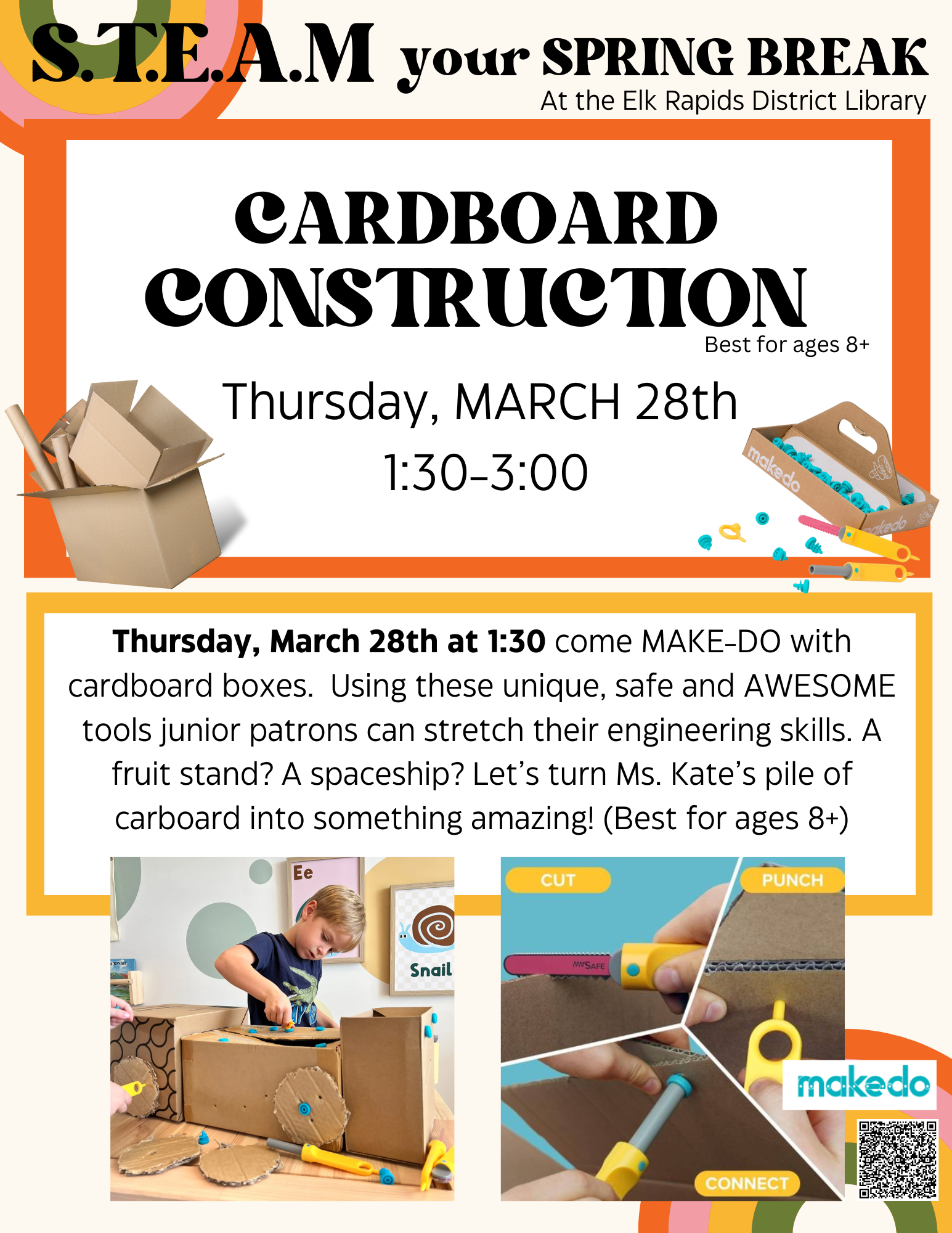 STEAM @ the Library: Cardboard Construction Thursday, March 28, 2024 1:30 PM 3:00 PM Elk Rapids District Library 300 Isles of Pine Elk Rapids, MI 49629 United States (map) Google Calendar ICS