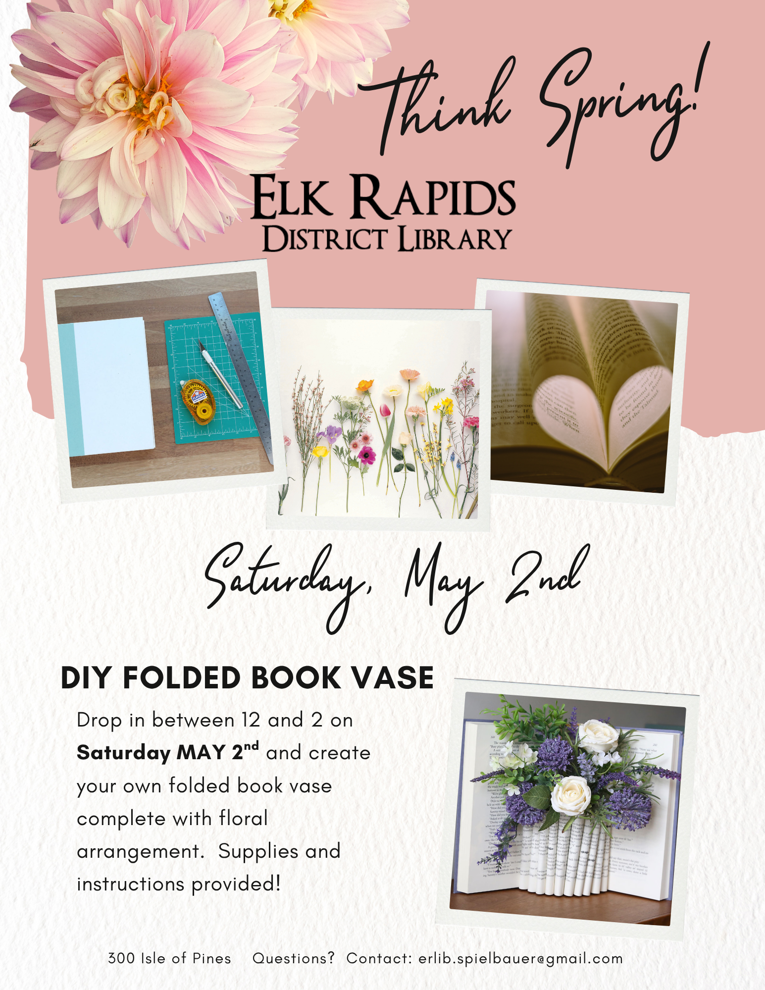 Spring Book Folding Program Saturday, May 2, 2026 12:00 PM 2:00 PM Elk Rapids District Library 300 Isles of Pine Elk Rapids, MI 49629 United States (map) Google Calendar ICS Drop in between 12 and 2 on Saturday MAY 2nd and create your own folded book vase complete with floral arrangement. Supplies and instructions provided!