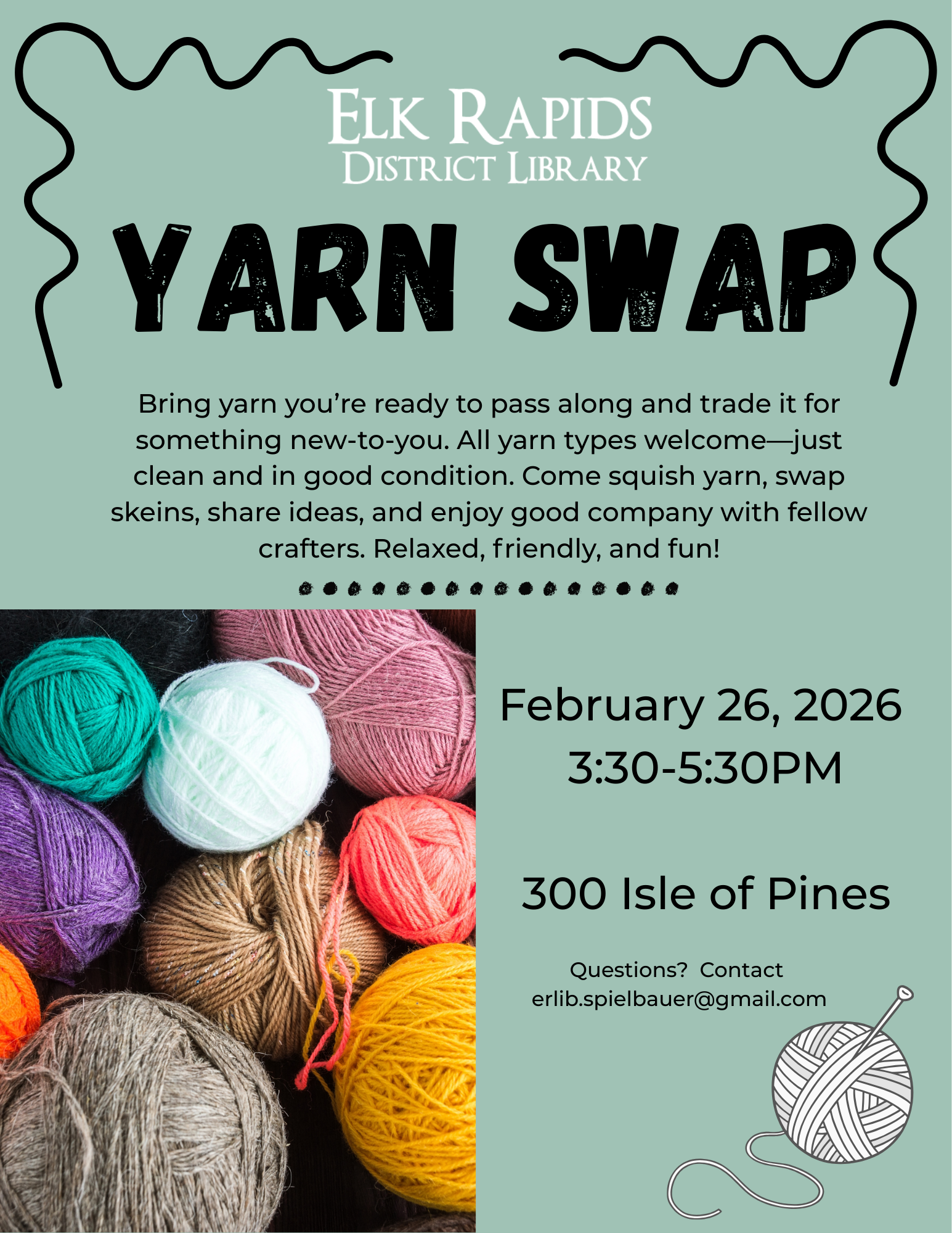 Yarn Swap Thursday, February 26, 2026 3:30 PM 5:30 PM Elk Rapids District Library 300 Isles of Pine Elk Rapids, MI 49629 United States (map) Google Calendar ICS