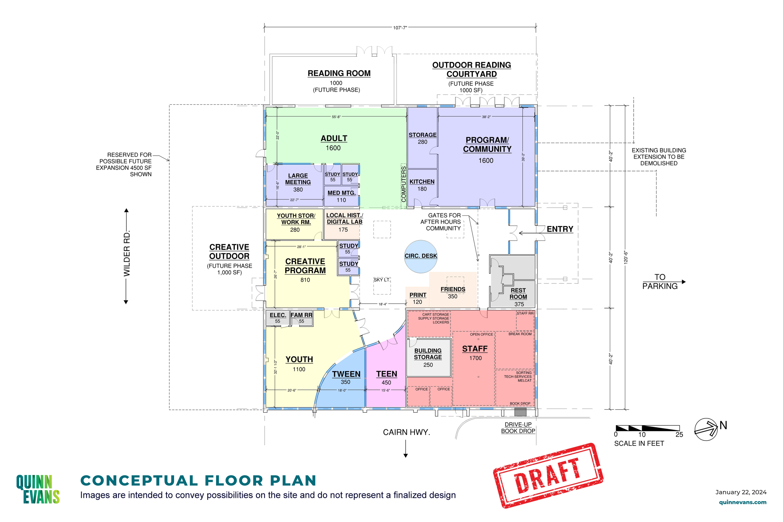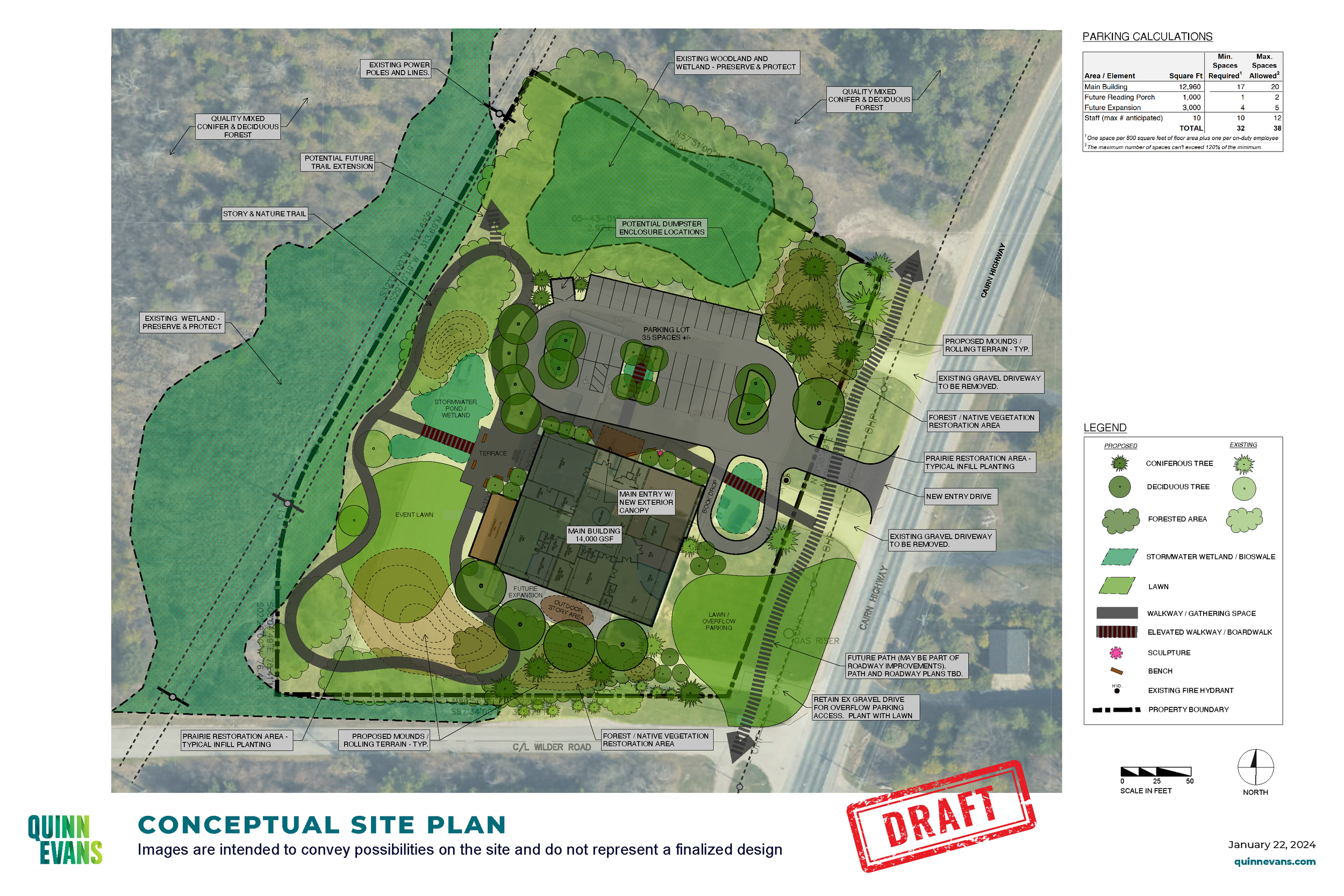 The prospective new site has opportunities to create indoor and outdoor spaces that expand the library’s impact, value and visibility in the community. Please click the button below to provide input or submit a question.