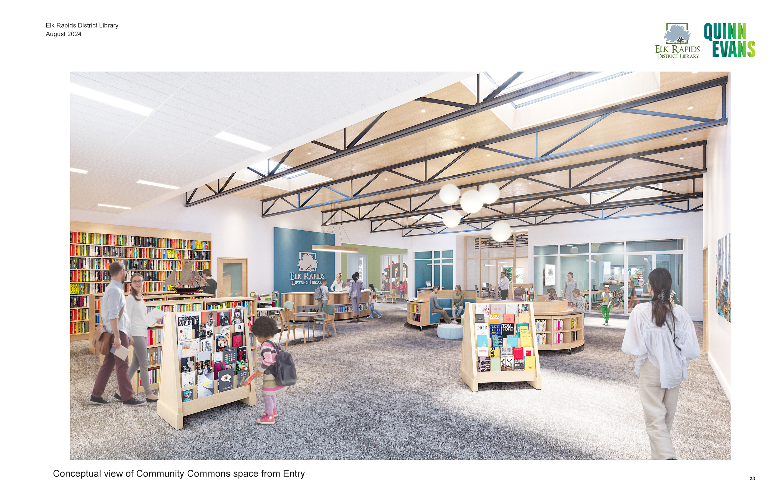 The vision of the Elk Rapids District Library is to provide a place for everyone with open and bright seating and dedicated spaces for children, teens, adults, reading, exploration, and community programs.